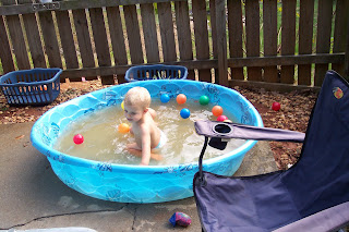 One of our neighbors has a pool and we got invited to play and cookout at their place. Andrew got in the little pool but would not get in the big pool. The food was great and the company was fun.